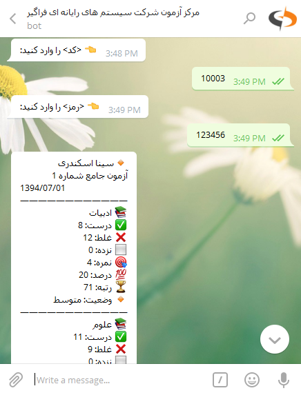به کمک آزمون ۳۶۰ شما می توانید آزمون های آنلاین تعریف شده در پنل کاربری را در تلگرام برگزار کنید. همچنین می توانید در تلگرام نتایج آزمون را به شرکت کنندگان اعلام کنید.